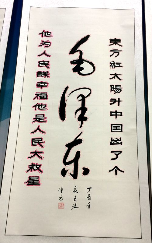 王校长讲,今年春夏之交,他又以“老三篇”和毛主席著作的研读、抄写,使他体验到了实用性书写的连贯意味,感受到毛泽东思想的博大精深,表达了自己对党的坚定信念,对毛主席的深切缅怀和无限崇敬之情。