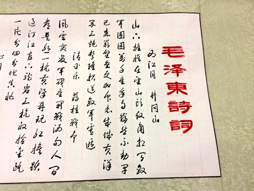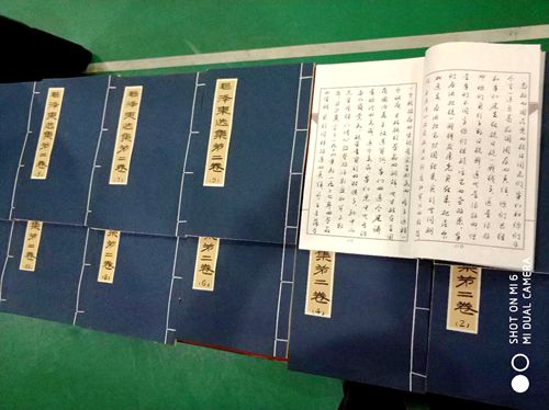 王建中校长退休后,从2015年初起,开始抄写毛主席选集。历时两年半,写完了毛选五卷,共写册页126本约110万字。随后,又将毛主席138首诗词,用隶书、楷书、草书各写了一遍,共写册页九本、20米长卷两幅。