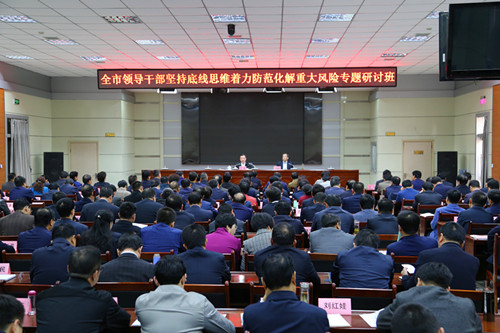 研讨班开班式由市委副书记王瑞峰主持,市长李毅在开班式上作了专题辅导。李毅要求参训人员高度重视本次专题研讨,坚持以习近平新时代中国特色社会主义思想为指导,全面贯彻落实党的十九大、省委十三届四次全会和市委五届六次全会精神,深刻认识和准确把握外部环境的深刻变化和改革发展稳定面临的新情况新问题新挑战,坚持底线思维,增强忧患意识,提高防控能力,着力防范化解重大风险,保持全市经济持续健康发展和社会大局稳定,为加快关中平原城市群次核心城市建设,实现渭南追赶超越提供坚强思想保障和组织保证。开班式结束后,参会人员分为6个小组进行学习研讨。
