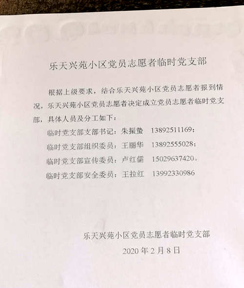 迅速响应号召。“疫”情阻击战打响后,乐天兴苑小区党员18名不同单位的党员响应中央和省市党委的号召,立即到所在宣化社区报到,按上级要求成立了以市生态环境局党员朱振蛰为党支部书记、市委党校党员王全芳为总协调员、市委党校党员王丽华为组织委员、市地震监测与服务中心党员卢红儒为宣传委员和市医保局党员王拉红为安全委员的乐天兴苑小区临时党支部。临时党支部结合当前工作形势和任务,明确了支部的工作任务,区分了支部成员的工作职责,按照市、区政府疫情防控工作领导小组的要求,紧张而有序地开展乐天兴苑小区的疫情防控卡点值守、信息排查和宣传报道以及安全防控工作。