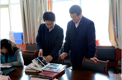 评估组组长张辉和常务副校长问康美查看干部教育影像资料
