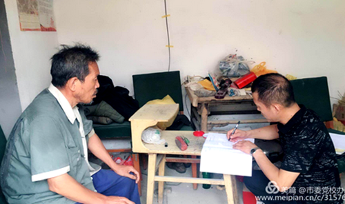 总务处校产科副科长陈德新不辞辛劳,入户了解情况,填写纪实。